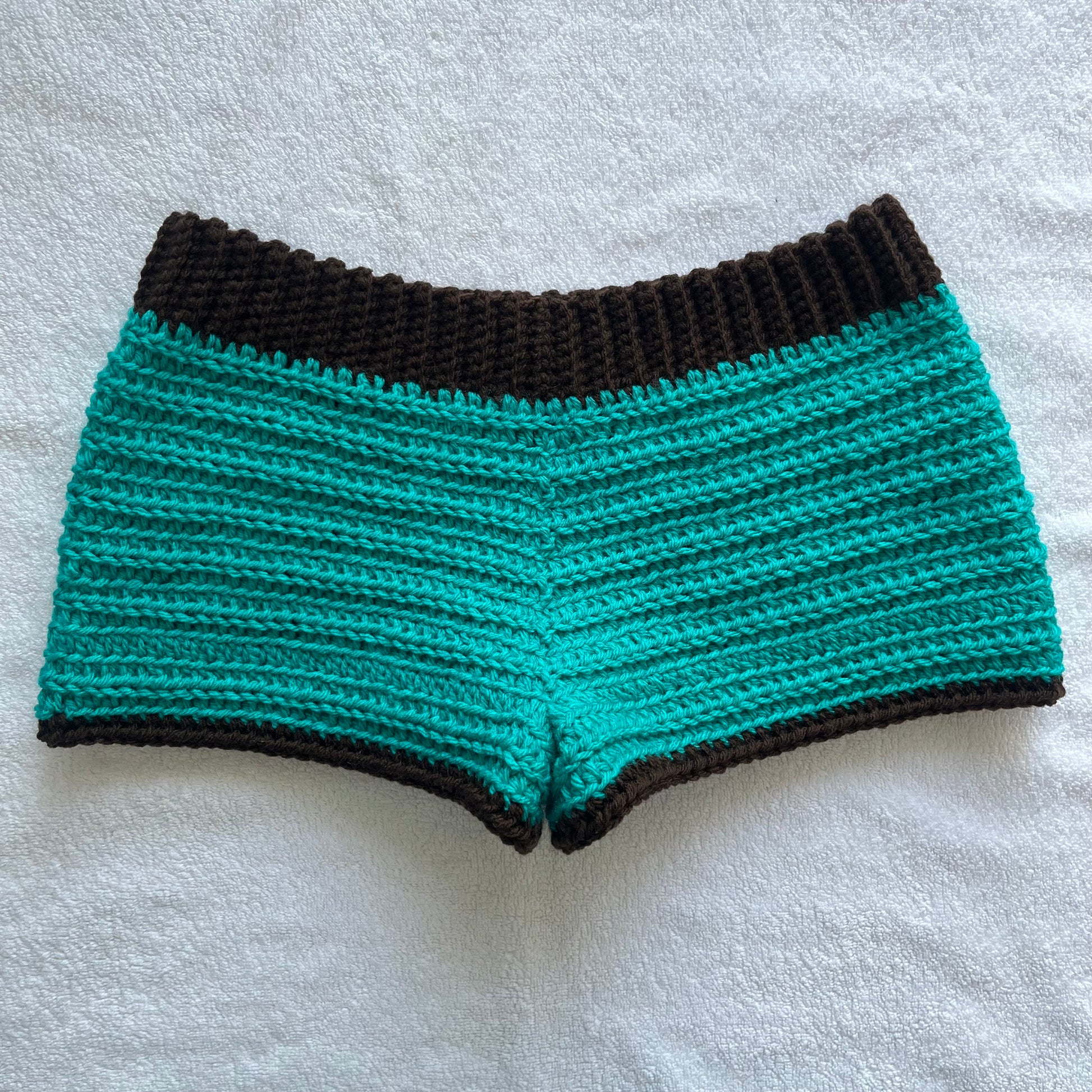 🎀The shorts waist band is made with a soft brown yarn and hugs your waist but is stretchable. The body of the shorts are made with soft blue yarn.🎀
